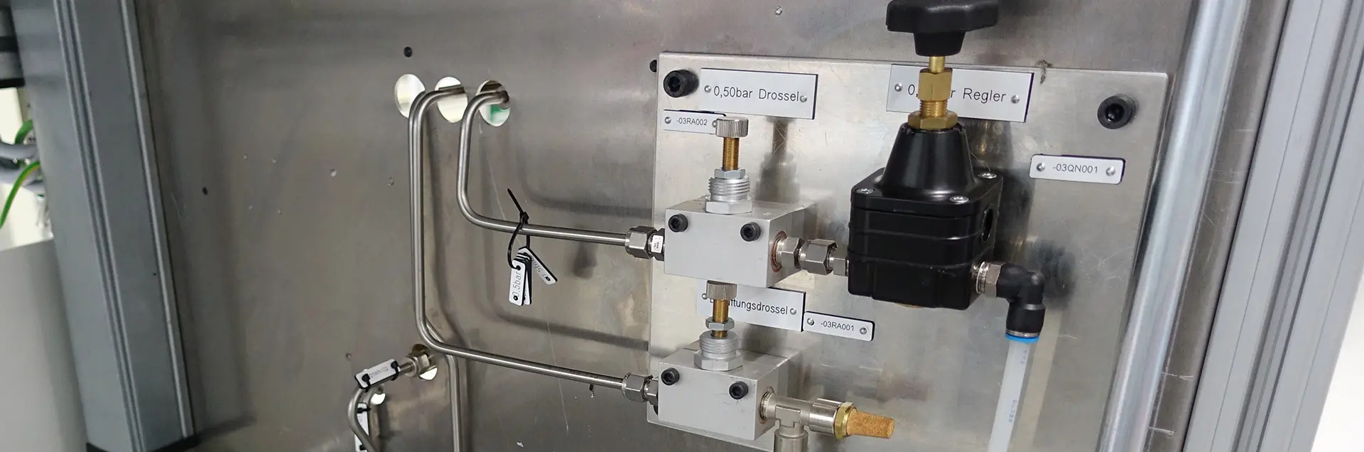 In einer Pilotlinie für eine Brennstoffzellenmontage wird an einem halbautomatischen Arbeitsplatz der Stack mit Luft dicht geprüft. Die Prüfungen laufen nach Anwahl durch das übergeordnete System vollautomatisch ab. Hierzu misst das Prüfsystem nach einer Grobleckprüfung die Dichtheit aller Räume im Stack nach außen (externe Prüfung) und in einem zweiten Schritt die Dichtheit der Räume zueinander (interne Prüfung), für die eine eigens dafür entwickelte Messtechnik zum Einsatz kommt.